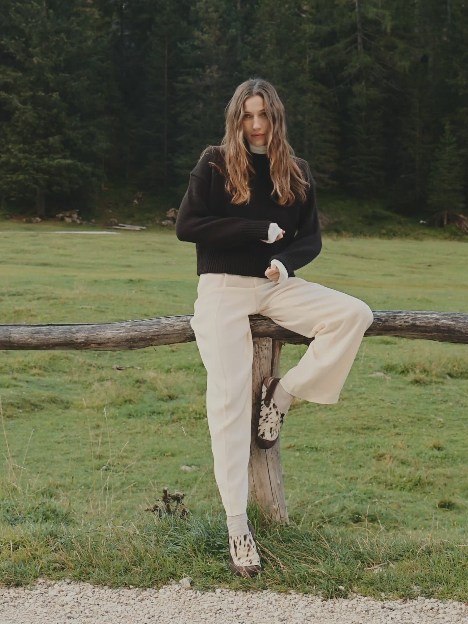 Zueco de piel combinado en serraje y pelo estampado animal con planta anatómica y hebilla ajustable al tobillo. Piel certificada por proveedores del Leather Working Group (LWG) con estatus oro.  Cada par de Genuins es único. Este modelo está elaborado en piel natural con estampado de vaca, lo que significa que pueden existir variaciones en el tono, la intensidad del estampado e incluso en la disposición de las manchas. Estas diferencias no son defectos, sino el reflejo de la autenticidad y el carácter propio de cada pieza.